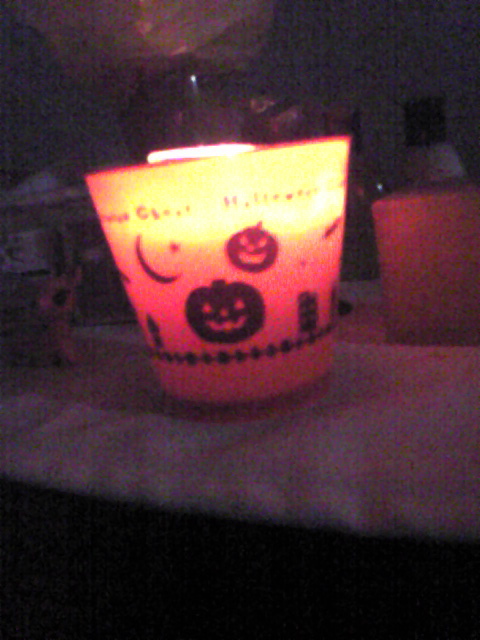 イタリアントマトのかぼちゃのカップケーキのカップもらってきて中にろうそく入れて火つけて部屋の電気消すとかぼちゃが暗闇に浮かび上がってとても雰囲気出るお。かわゆす(´ω`)